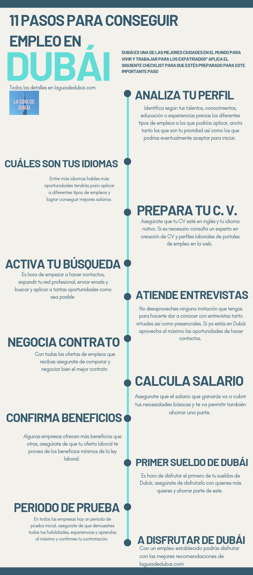 Esperamos que guardes y apliques nuestra guía de 11 pasos para conseguir un empleo en Dubái. No dudes en compartirla con tus amigos y familiares usando los botones abajo! también podemos asesorarte de forma privada en tu proceso de búsqueda de empleo en Dubái y Emirátos Árabes Unidos en el siguiente formulario