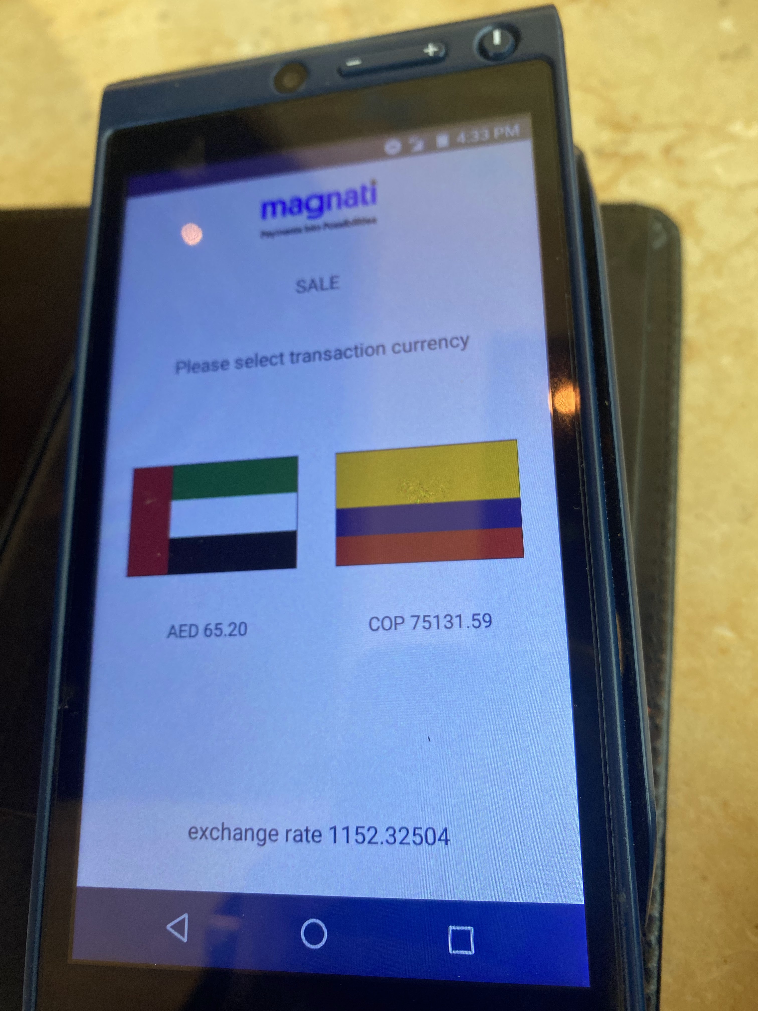 Como se puede observar en la imagen, las dos opciones que se presentaban antes de finalizar la transacción permitía a escoger entre un pago de 65.20 AED dirhams de la moneda local de Emiratos Arabes Unidos VS una opcion de pagar 75131.59 en COP la moneda oficial de Colombia.